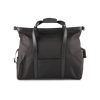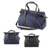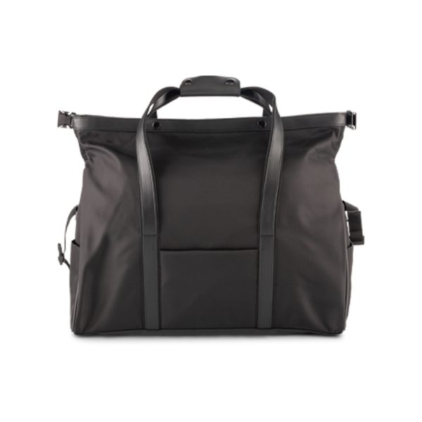Maletín para viaje en nylon y correas cubiertas en imitación cuero. Un bolsillo frontal con botón de seguridad. Dos bolsillos laterales con botón de seguridad. Dos botones de seguridad y dos hebillas para el bolsillo principal. Banda posterior para enganchar en trolley. Tiene la posibilidad de cargarla por medio de dos manijas o reata para colgársela.