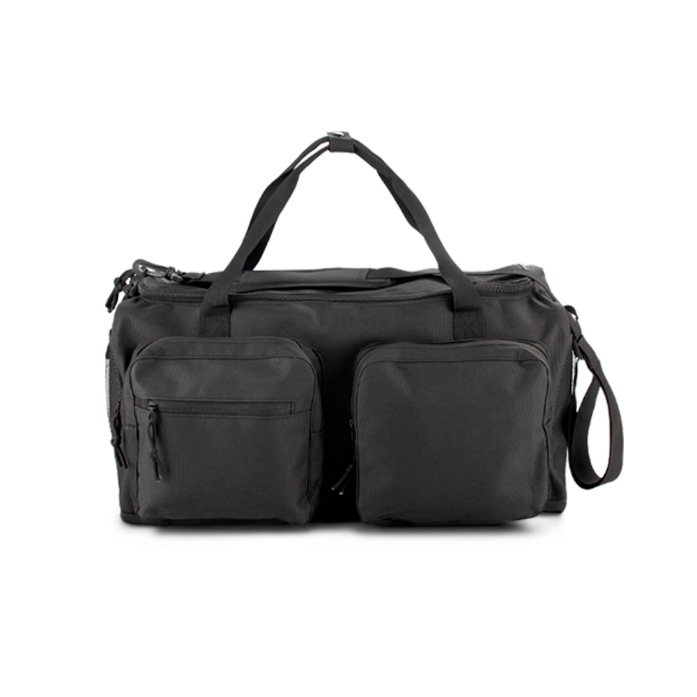 Maletín deportivo en poliéster y PVC. Un bolsillo externo. Tres bolsillos frontales con cremallera. Dos bolsillos laterales con malla elástica. Manijas para colgar.