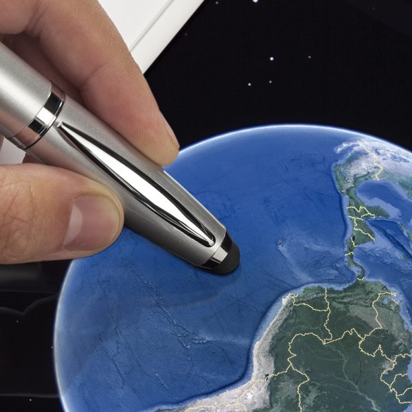 Bolígrafo metálico USB parte superior con stylus, dos minas adicionales. Empaque estuche PVC.