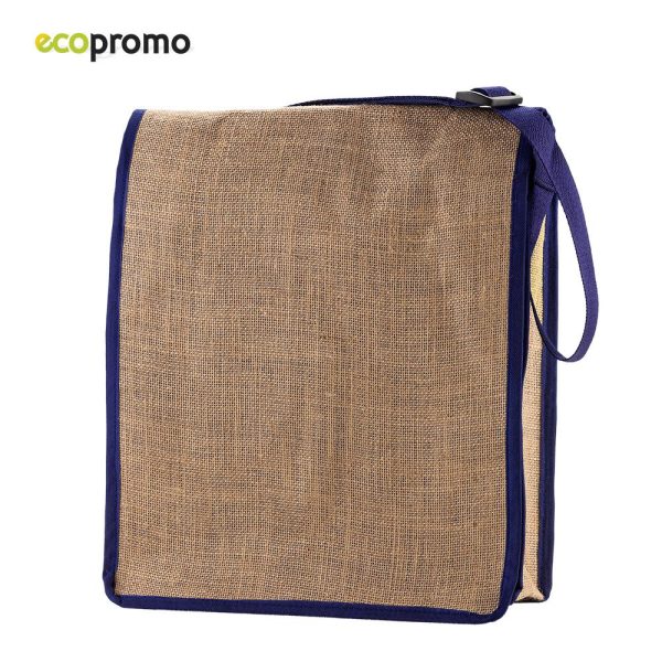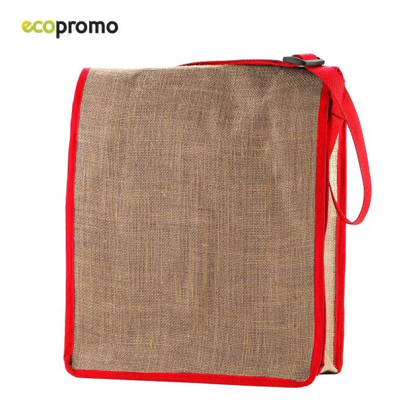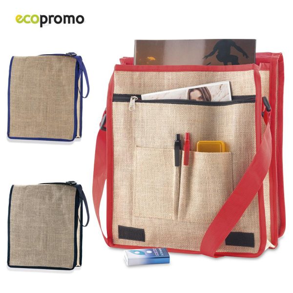 Bolso en Yute con reata en algodón y bordes de color con cierre en velcro. Bolsillo interno con cremallera. Bolsillo organizador.