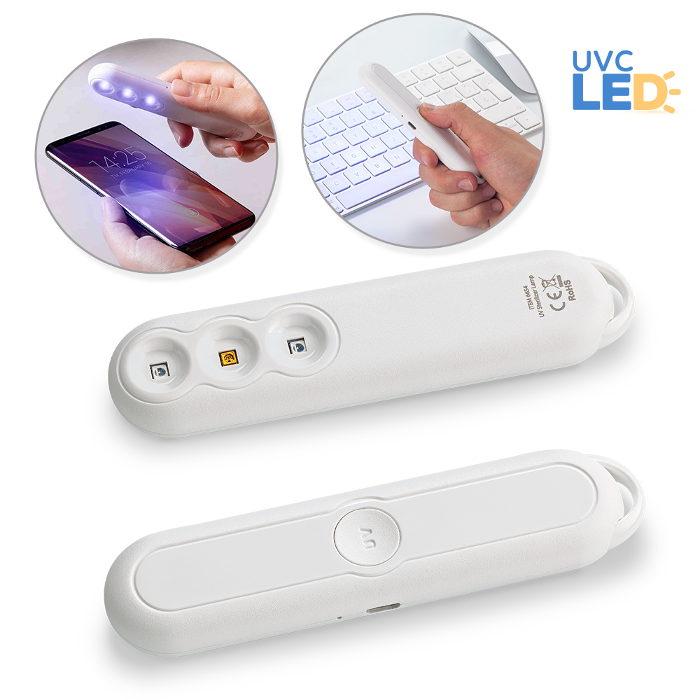 Plástico ABS, fácil de usar: basta con acercar al objeto durante unos segundos, a una distancia de entre 1 y 2 cm para eliminar microorganismos presentes en las superficies. Potencia 1.5W, longitud de onda de 275 nm, voltaje 3V, con batería recargable integrada (Cable USB incluido).