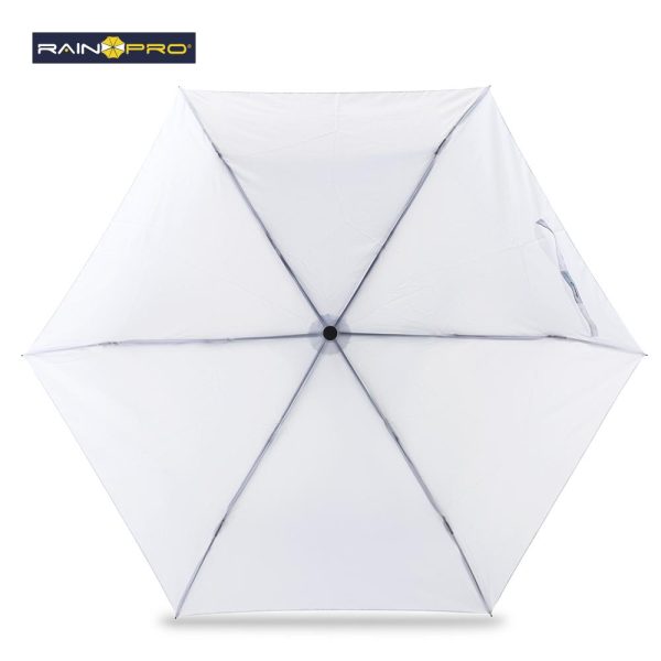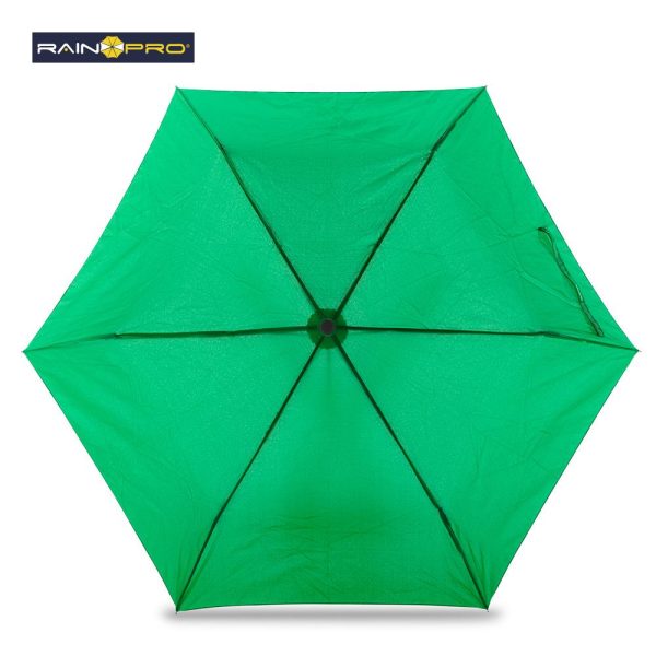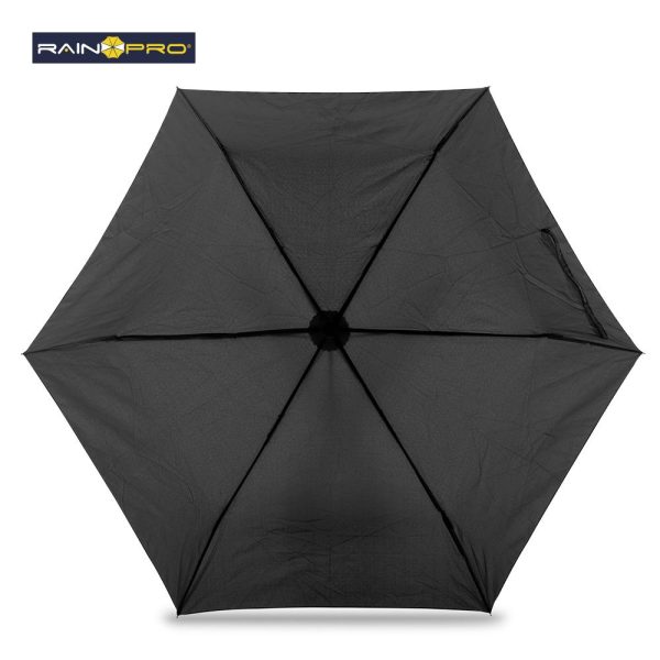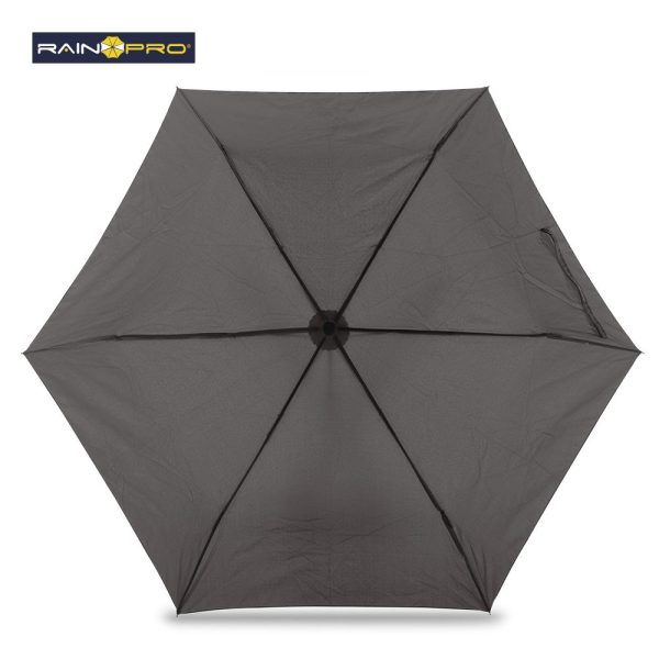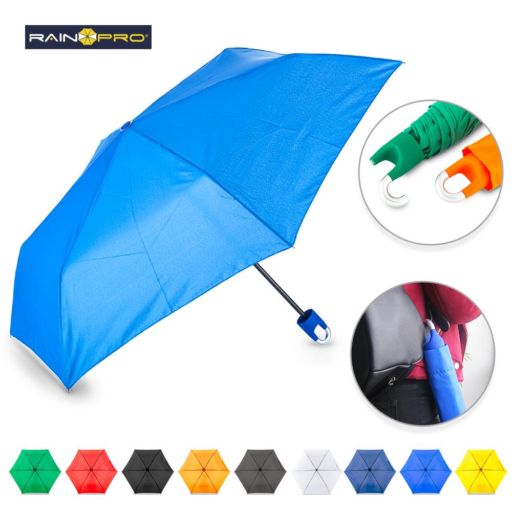 Poliéster pongee 190T. Mango ergonómico en plástico acabado caucho y punta con gancho decorativo para girar y colgar. Apertura y cierre manual. 6 Cascos. Con forro para cargar.