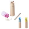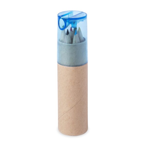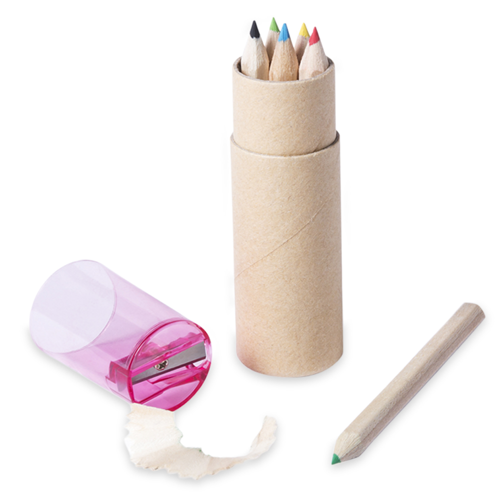Mini estuche de cartón con 6 colores y tajalápiz plástico.