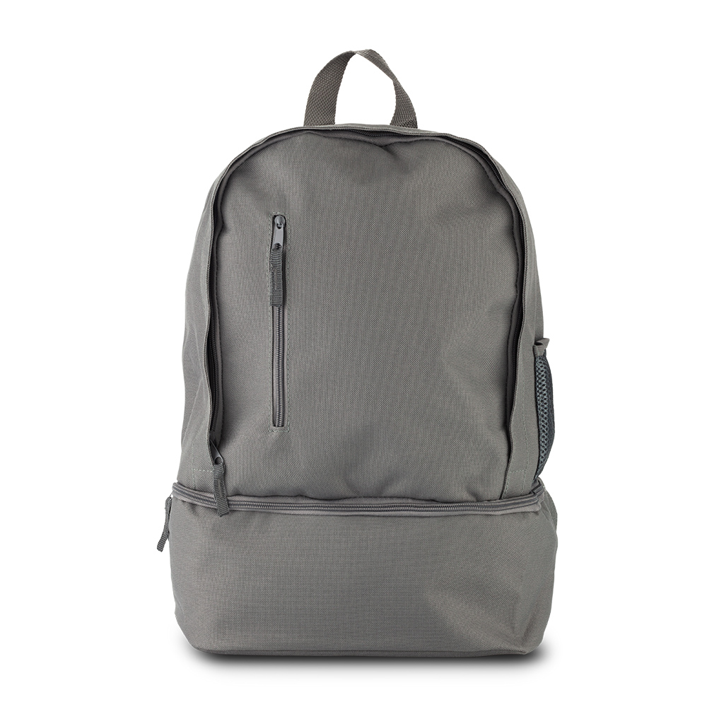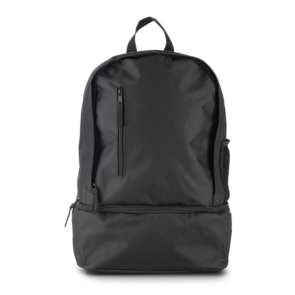 Morral en poliéster, con bolsillo frontal con cremallera y bolsillo lateral en malla portabotella. Con bolsillo guarda zapatos.