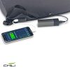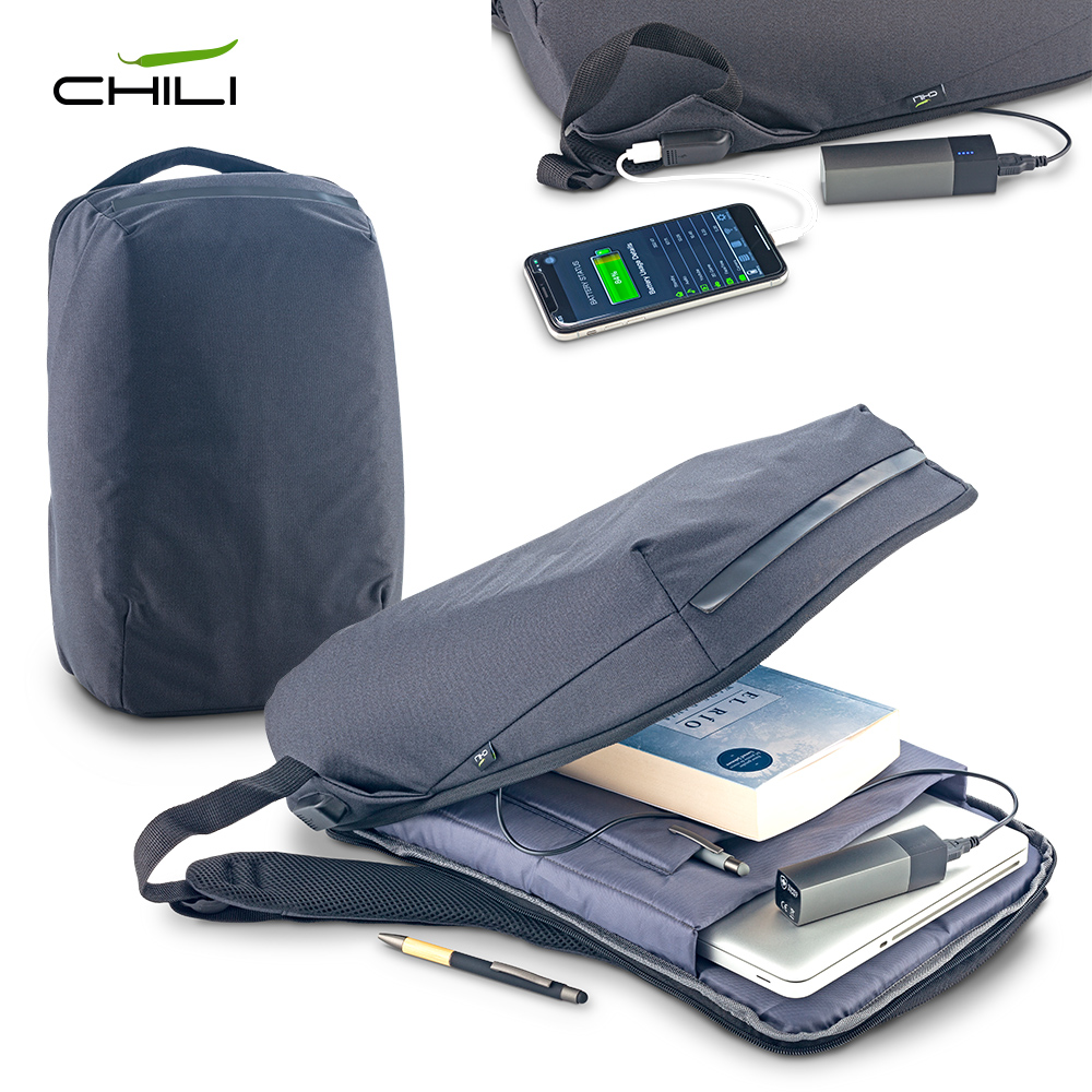 Morral para portátil en poliéster resistente a salpicaduras, apertura trasera antirrobo. Compartimento interior acolchado para portátil de hasta 15” y tablet. Cable USB para conectar pila desde el interior (pila no incluida). Bolsillos organizadores internos y espaldar acolchado.