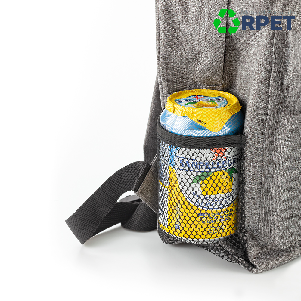Morral elaborado en poliéster reciclado (PET reciclado de botellas de agua), un compartimento y un bolsillo exterior. Una malla lateral.