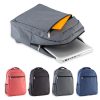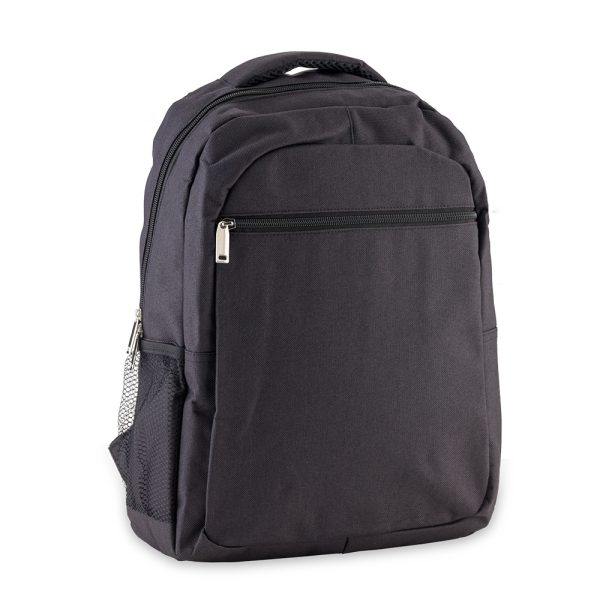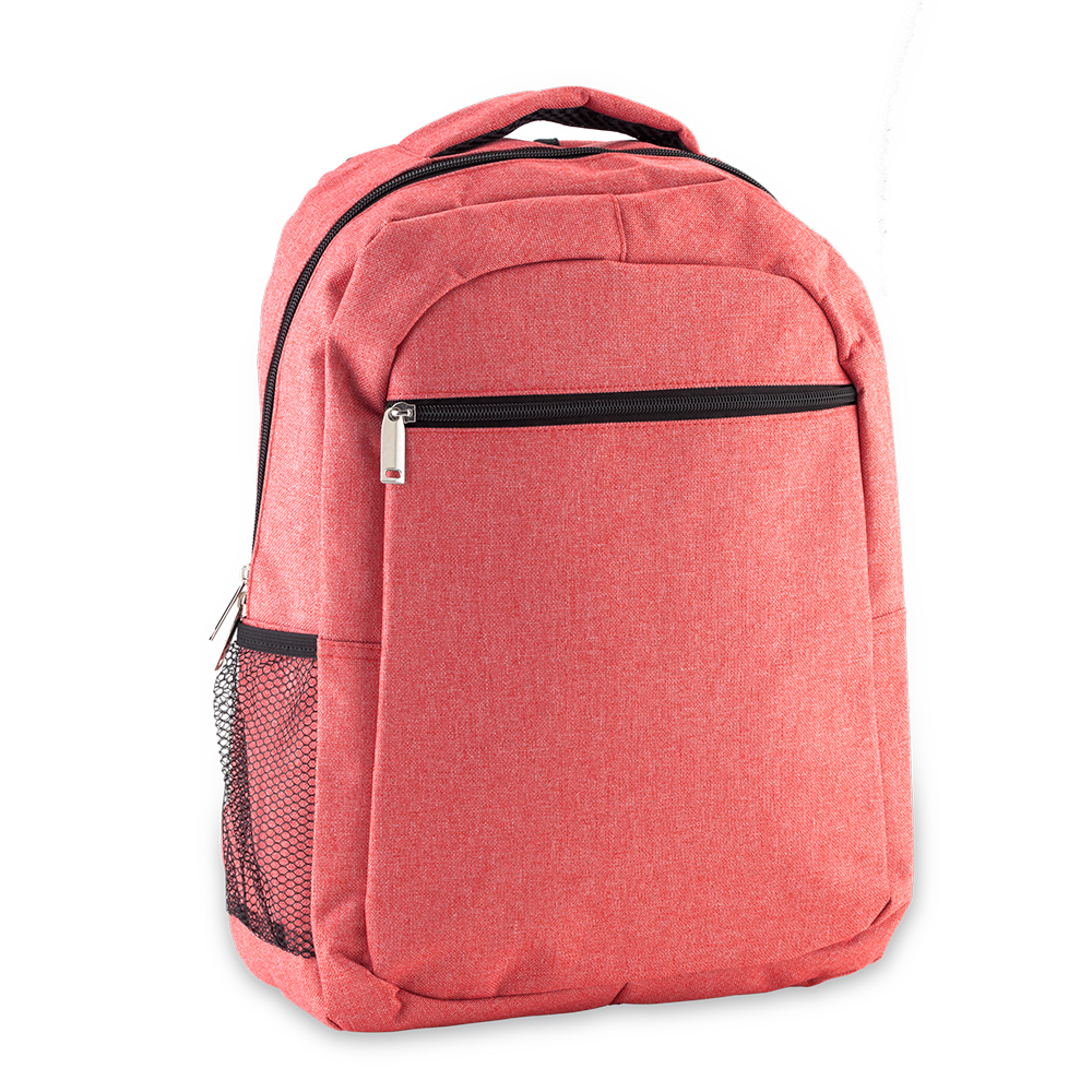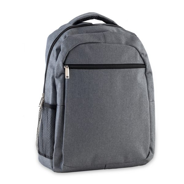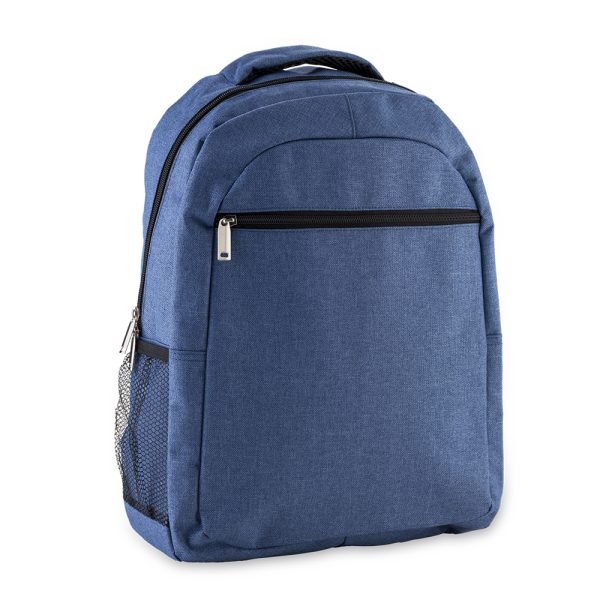 Morral backpack en poliéster con dos bolsillos, bolsillo para laptop y malla portabotella.