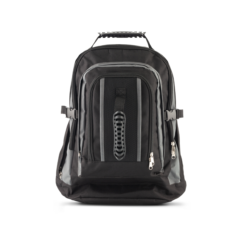 Morral backpack en poliéster. Cuatro bolsillos externos con cremallera. Dos hebillas de seguridad y una manija central en caucho.