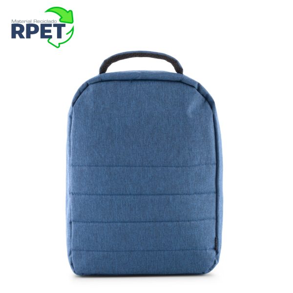 Morral backpack en poliéster reciclado RPET. Apto para portátil de hasta 15″. Banda posterior para enganchar en trolley.