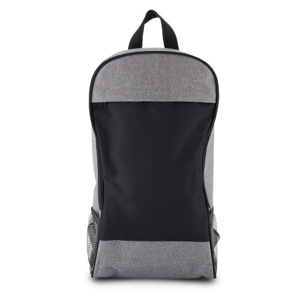 Morral en poliéster 600D, con bolsillo frontal con cremallera y bolsillos laterales en malla portabotella.
