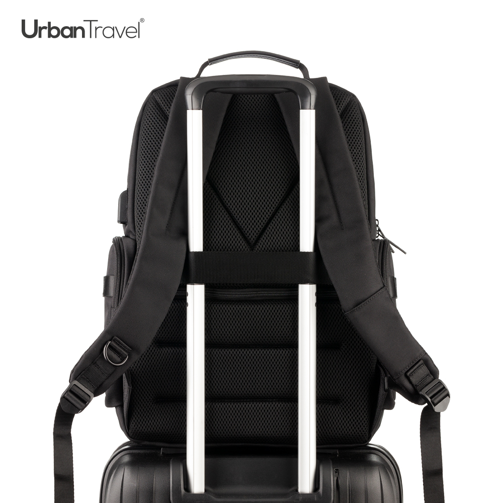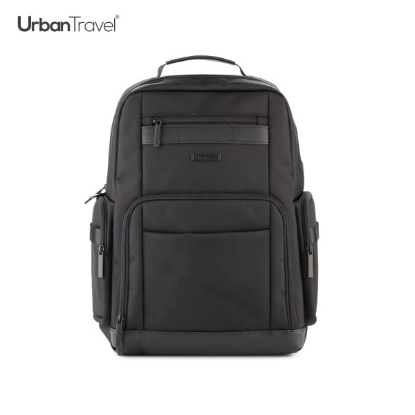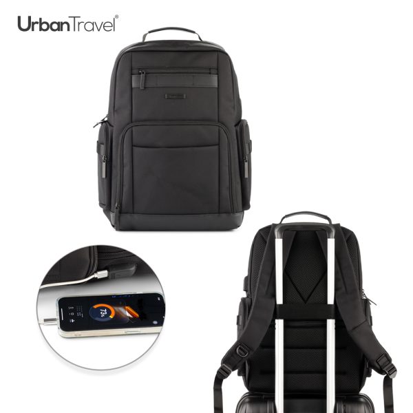 Morral backpack en poliéster. Apto para portátil de hasta 15″. Tres bolsillos externos con cremallera. Un bolsillo externo sin cremallera. Dos bolsillos laterales con cremallera. Puerto USB para cargar desde el interior (no incluye la pila). Bolsillo escondido en el espaldar con cremallera. Banda posterior para enganchar en trolley.