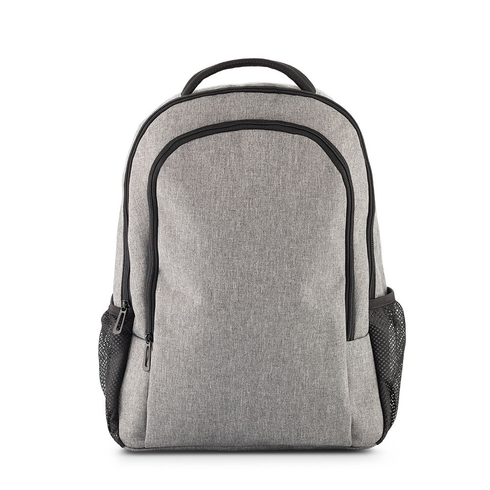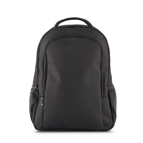 Morral backpack en poliéster. Apto para portátil de hasta 15″. Dos bolsillos externos con cremallera. Dos bolsillos laterales en malla. Banda posterior para enganchar en trolley.
