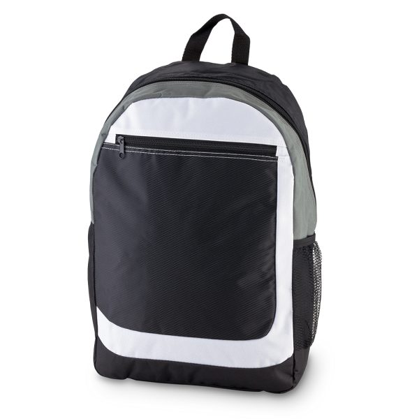 En poliéster 600D, dos bolsillos, malla portabotella, espaldar acolchado.