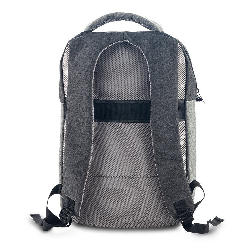 Morral en poliéster, bolsillo principal con compartimento para laptop de 14” y bolsillo frontal. Tirantes y espaldar semi-acolchados. Con banda posterior para enganchar al trolley.