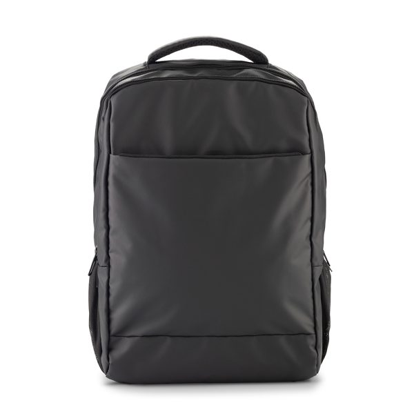 Morral backpack en poliéster. Apto para portátil de hasta 15″. Tres bolsillos externos con cremallera. Dos bolsillos laterales en malla. Banda posterior para enganchar en trolley.