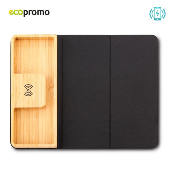 Con cargador inalámbrico de 10W y organizador de elementos pequeños elaborado en bambú. Empaque caja individual.