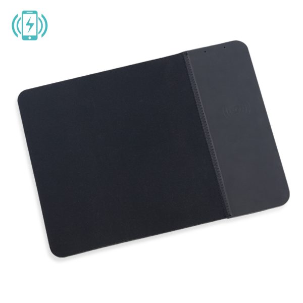 Mouse pad en EVA con cargador inalámbrico forrado en PU. Input: 9V 2A. Output:9V 1.2A. Protección contra corto circuito.