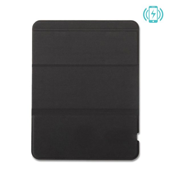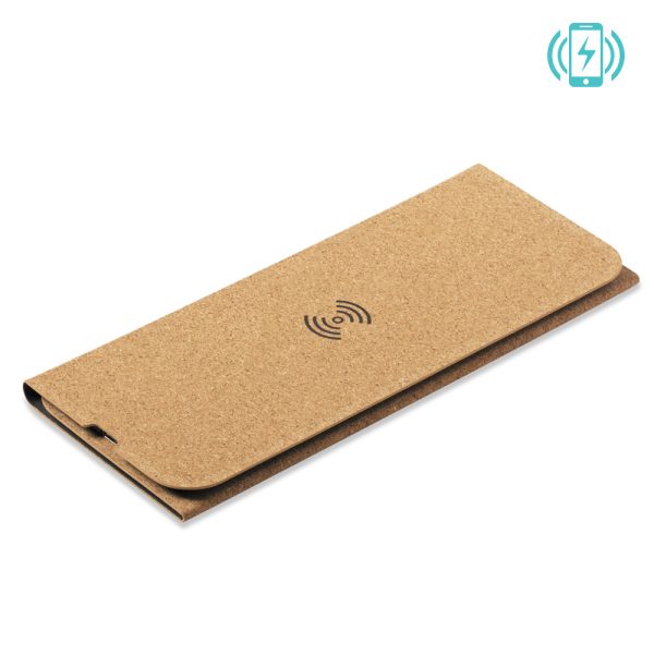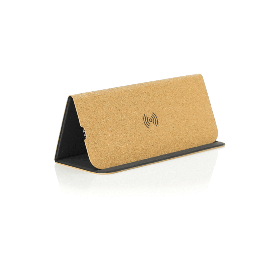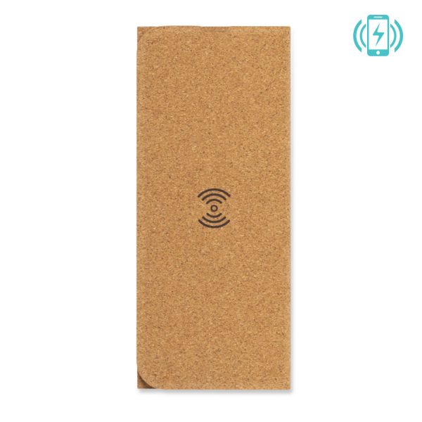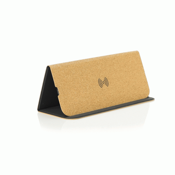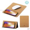 Mouse pad en corcho. Con cargador inalámbrico integrado -cable Tipo C incluido para conectar el cargador inalámbrico-, base antideslizante y soporte para móvil. Input: 5V 1.5A. Output:5V 1A 5W. Empaque caja individual.