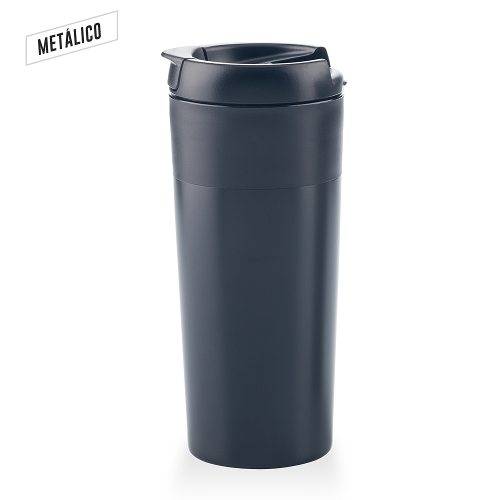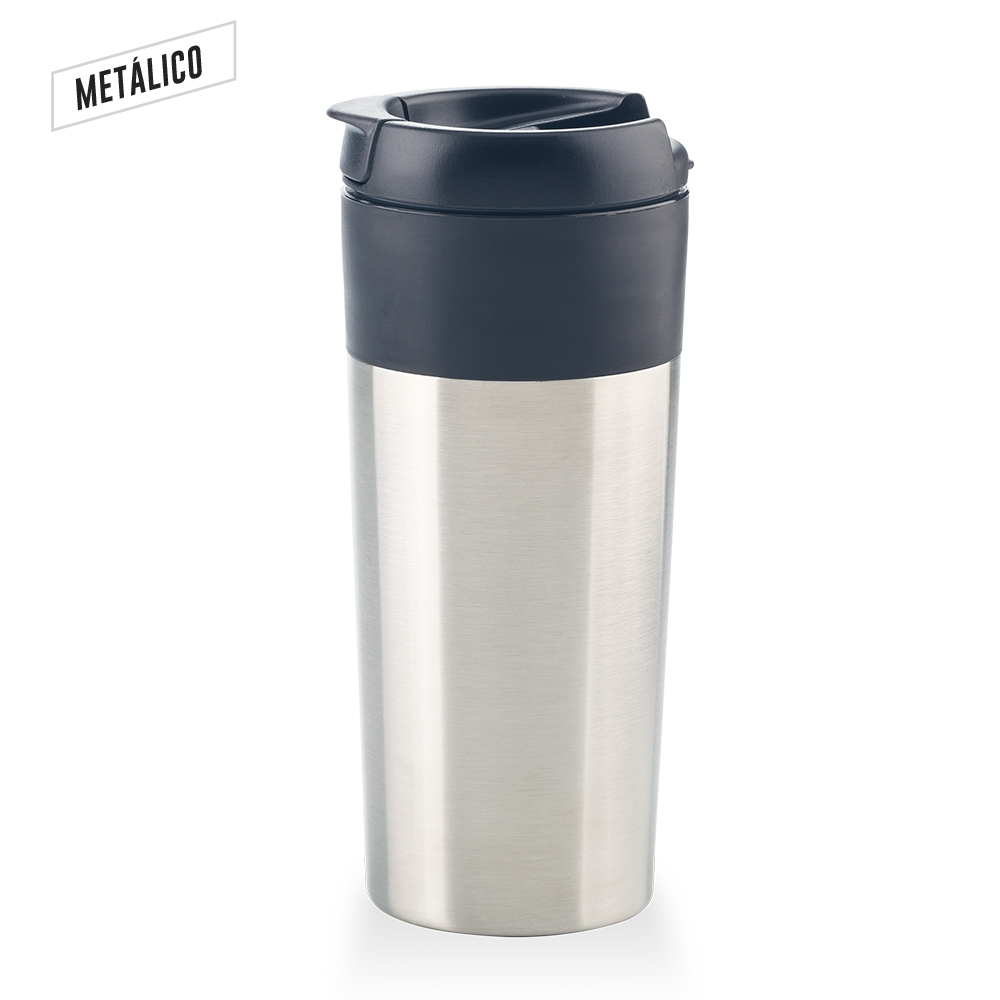 Mug metálico con interior plástico, tapa rosca. La tapa es una tapa protectora de cierre a presión, no es tapa de seguridad. Empaque Caja Individual.