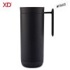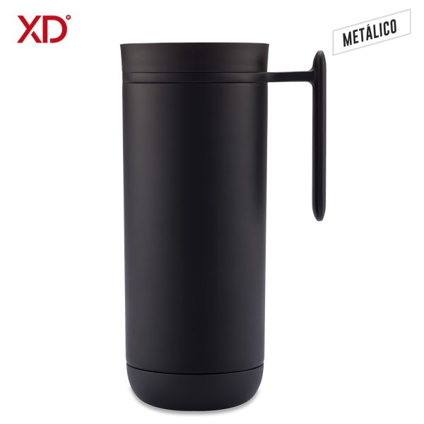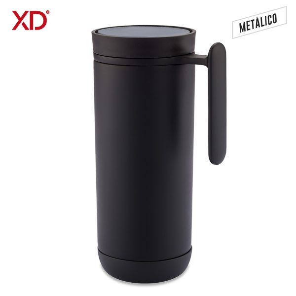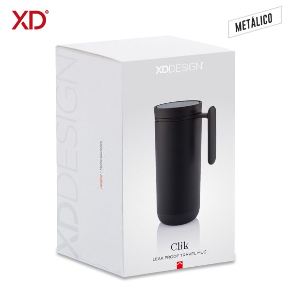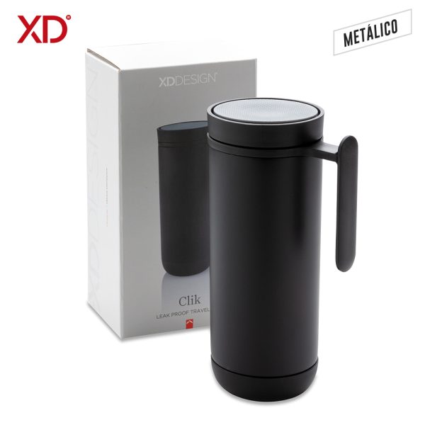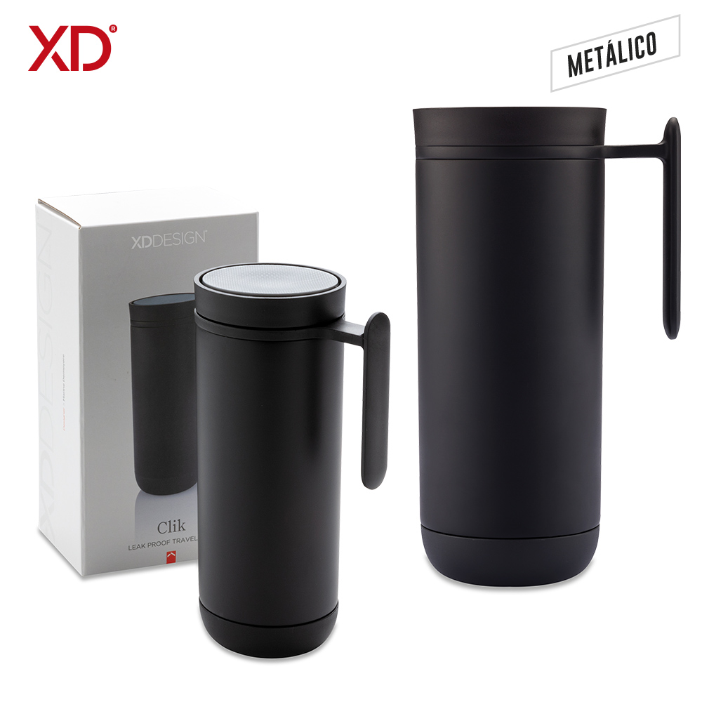 Mug doble pared en acero inoxidable y plástico, tapa inteligente de 360º que puede ser abierta y cerrada con un solo toque. Libre de BPA y apto para lavar a mano. Diseño registrado®. Empaque caja individual.
