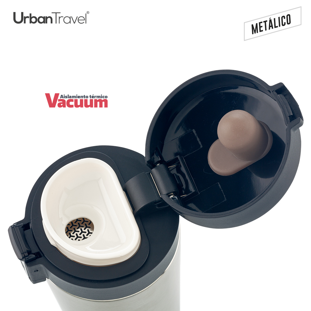 Doble pared en acero Inoxidable, con aislamiento térmico que mantiene la bebida fría o caliente hasta 6h, aprox (puede variar dependiendo condiciones climáticas). Tapa tipo lock y filtro metálico interno. Empaque caja individual.