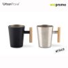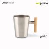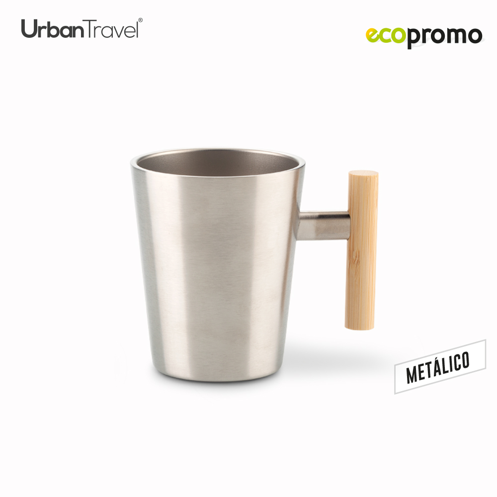 Mug metálico en acero inoxidable doble pared con manija en bambú. Empaque caja individual.