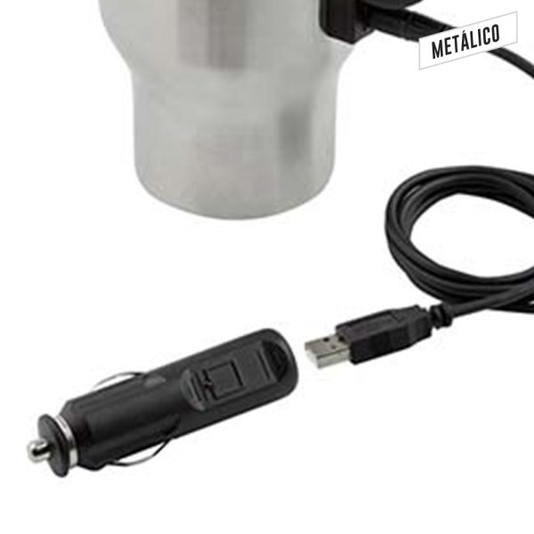 Mug exterior en acero inoxidable, con interior plástico y tapa de presión. Con cargador para USB y accesorio para conectar a carro. Lavar a mano, mantiene la bebida a 70° C aprox. La tapa es una tapa protectora de cierre a presión, no es tapa de seguridad. Empaque caja individual.
