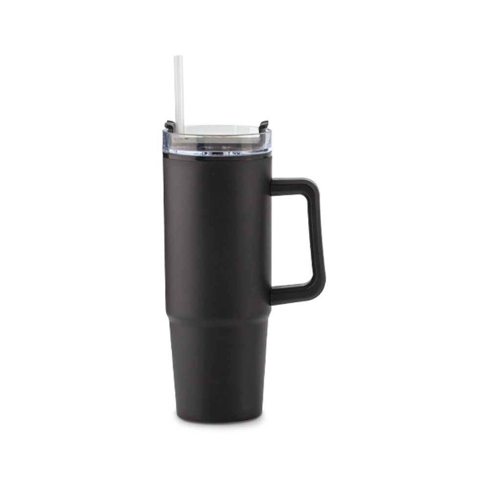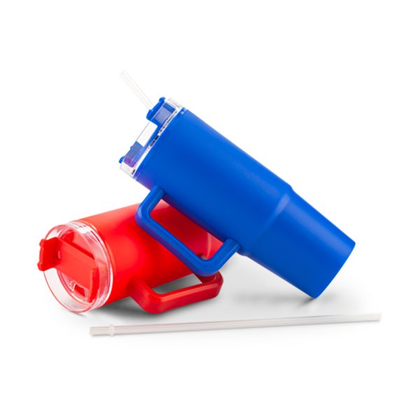 Mug plástico doble pared con interior plástico, tapa y pitillo. La tapa es una tapa protectora de cierre a presión, no es una tapa de seguridad. Empaque caja individual.