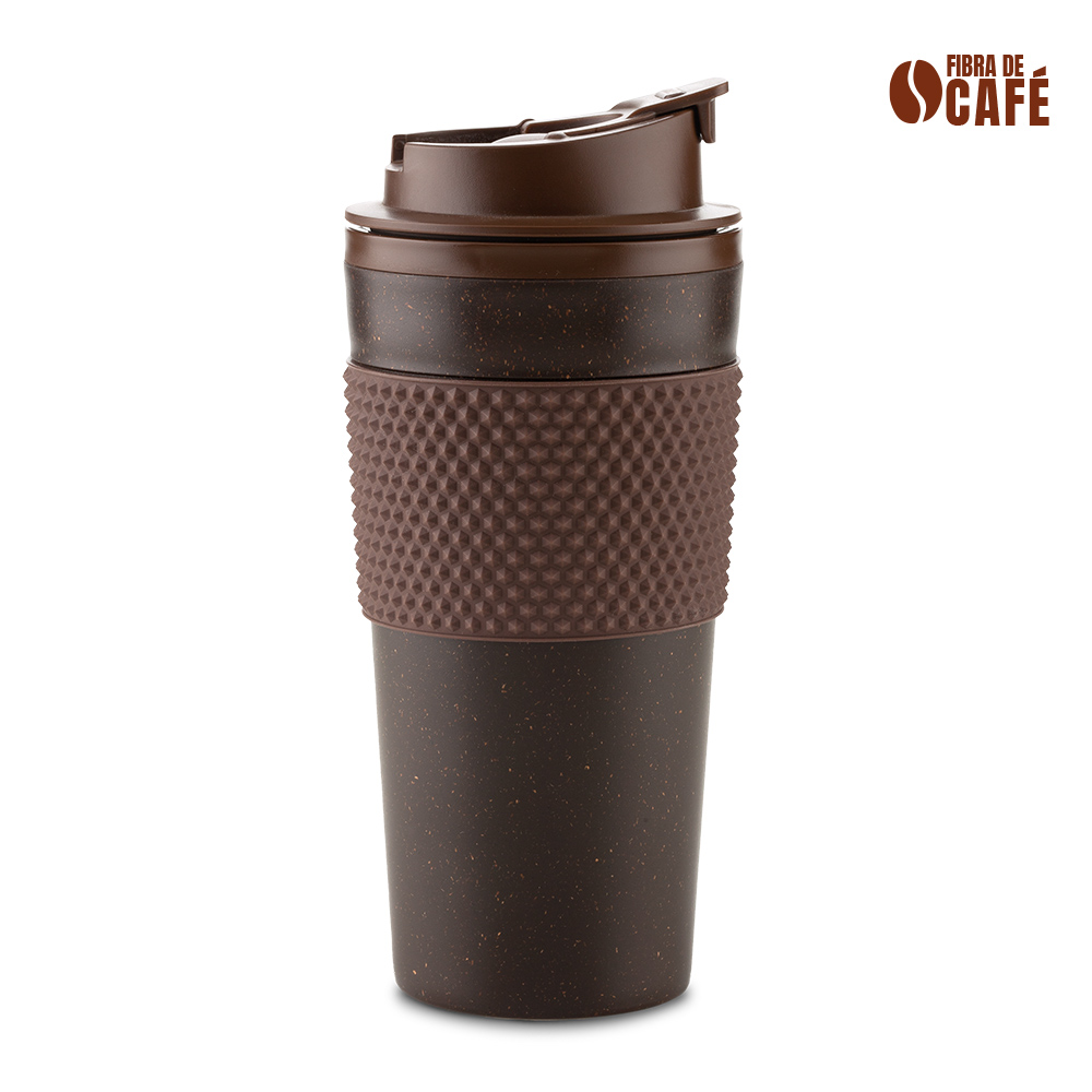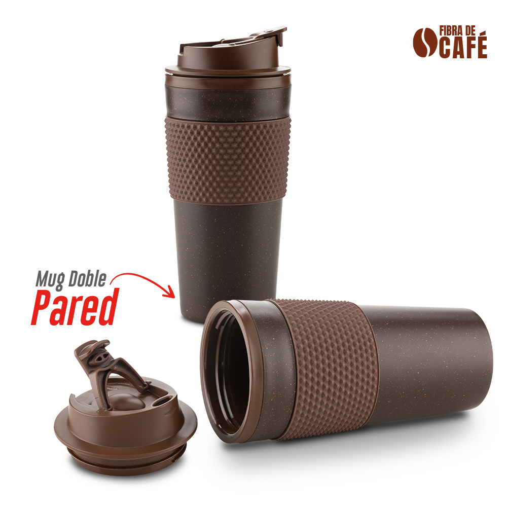 Mug plástico doble pared en fibra de café, tapa rosca plástica.