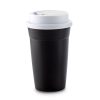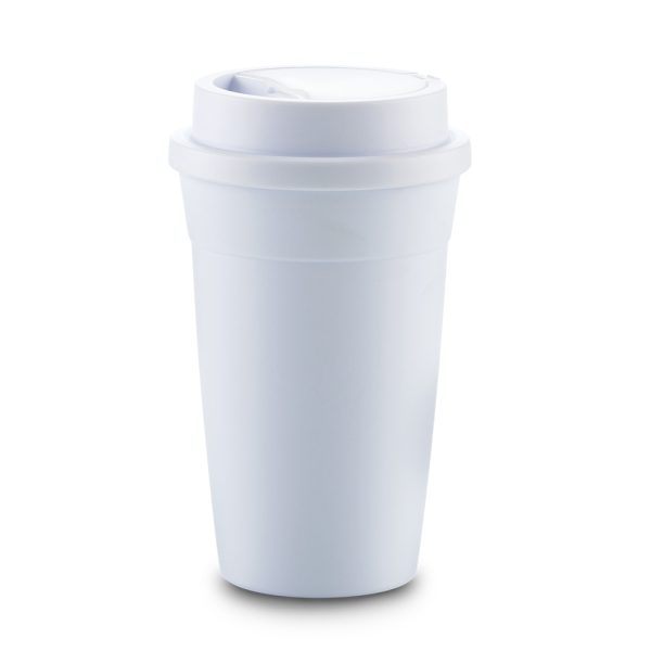 Mug plástico con tapa rosca y compartimento en la tapa con pitillo en silicona incluido. Apto para bebidas frías o ligeramente tibias.