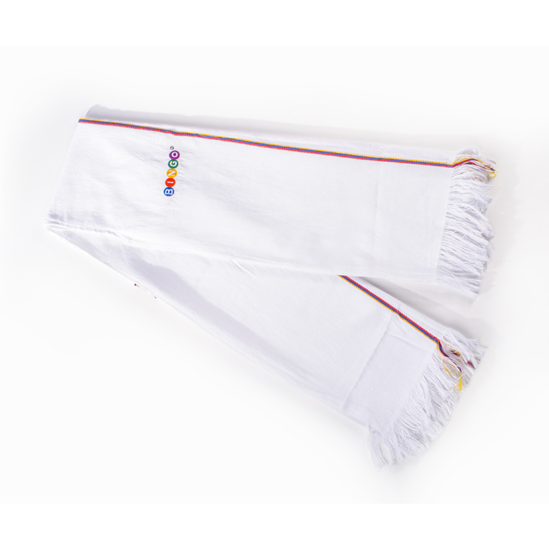 Mulera publicitaria con rayas bandera de Colombia o unicolor (blanca o beige). Logo bordado.