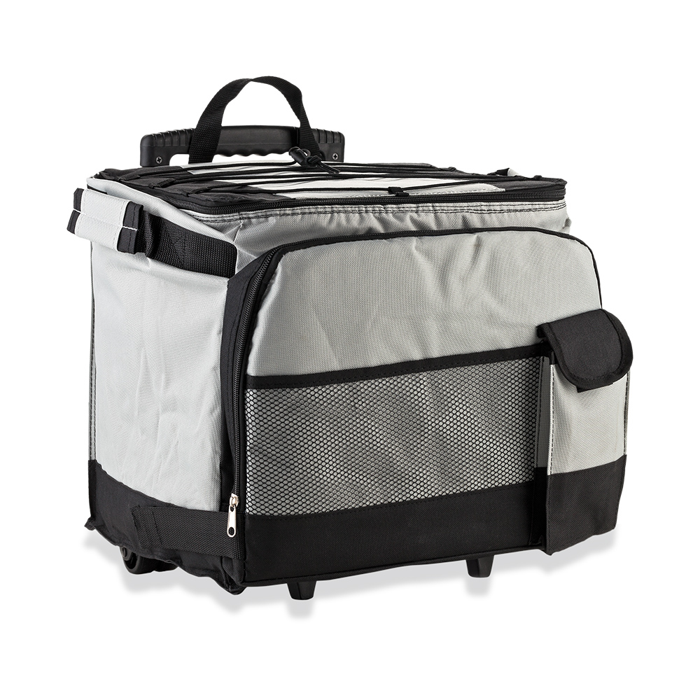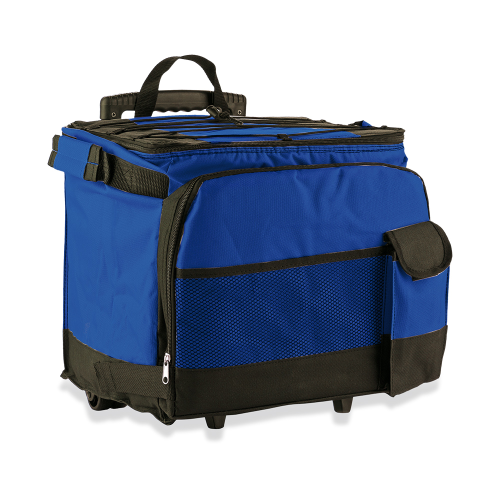 Nevera con ruedas, manija metálica extensible, bolsillo exterior y tres agarraderas.