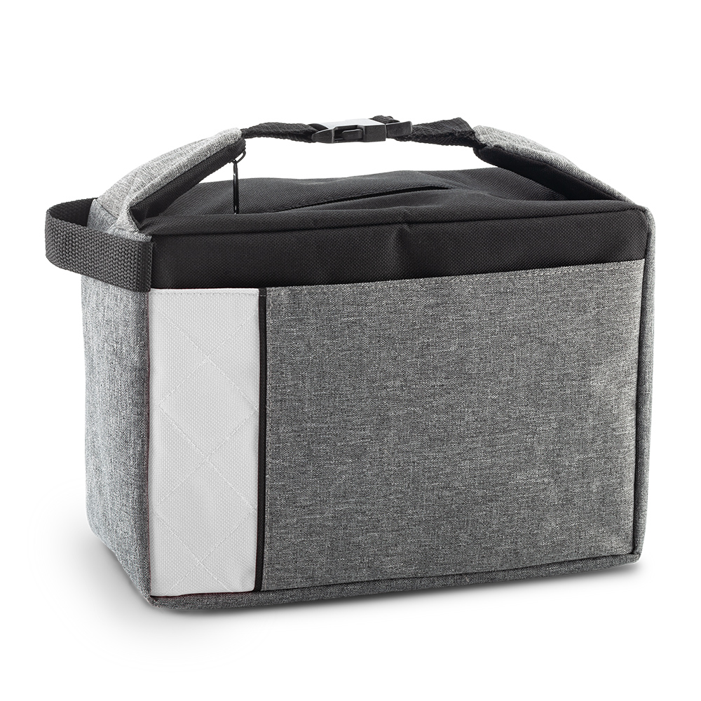 Nevera en poliéster con recubrimiento interior en PVC que conserva las bebidas o alimentos fríos por más tiempo. Broche de cierre y manija lateral para cargar.