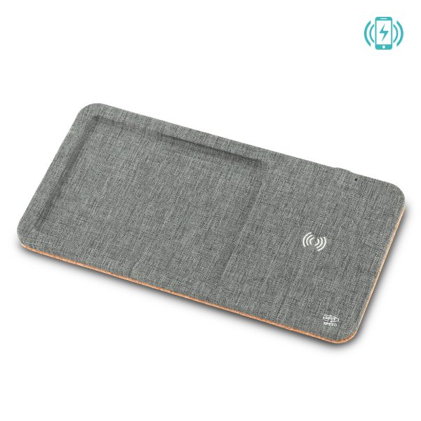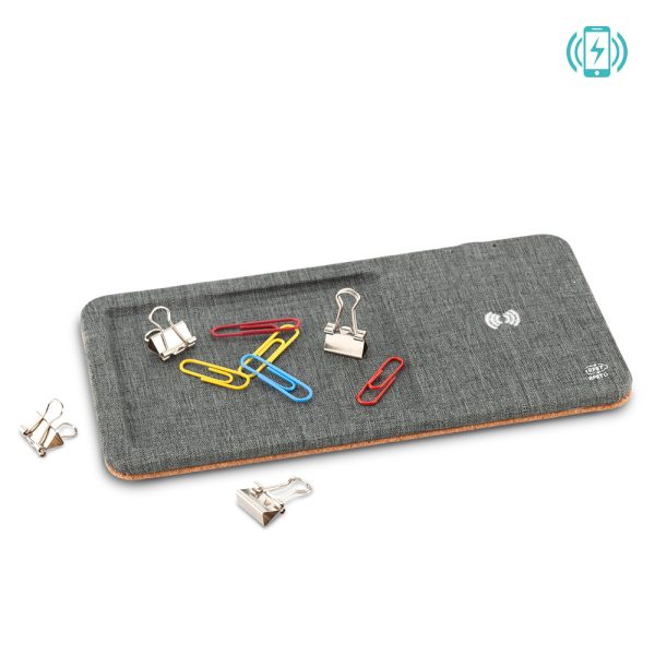 Organizador de escritorio en poliéster reciclado RPET y corcho. Con cargador inalámbrico de 10W. Compatible con dispositivos equipados con tecnología de carga inalámbrica. Empaque caja individual.