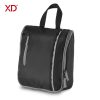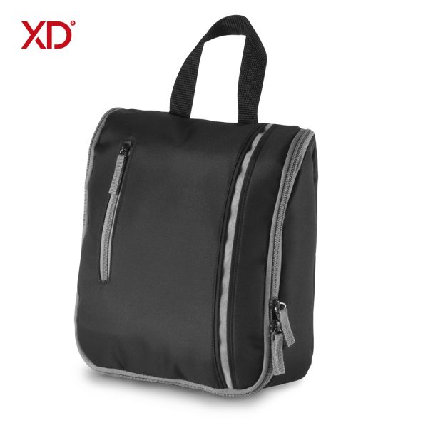 En microfibra, con 6 compartimentos y bolsillo externo. Incluye gancho para colgar.