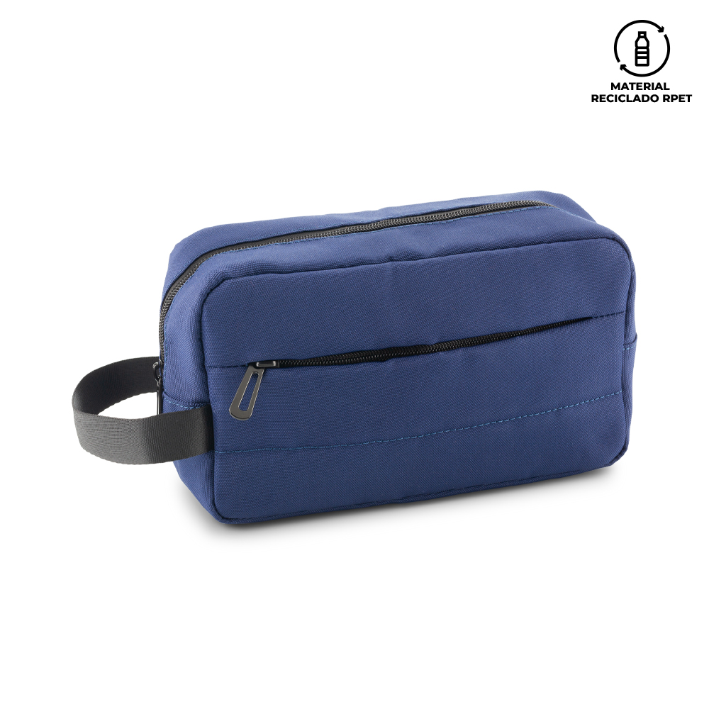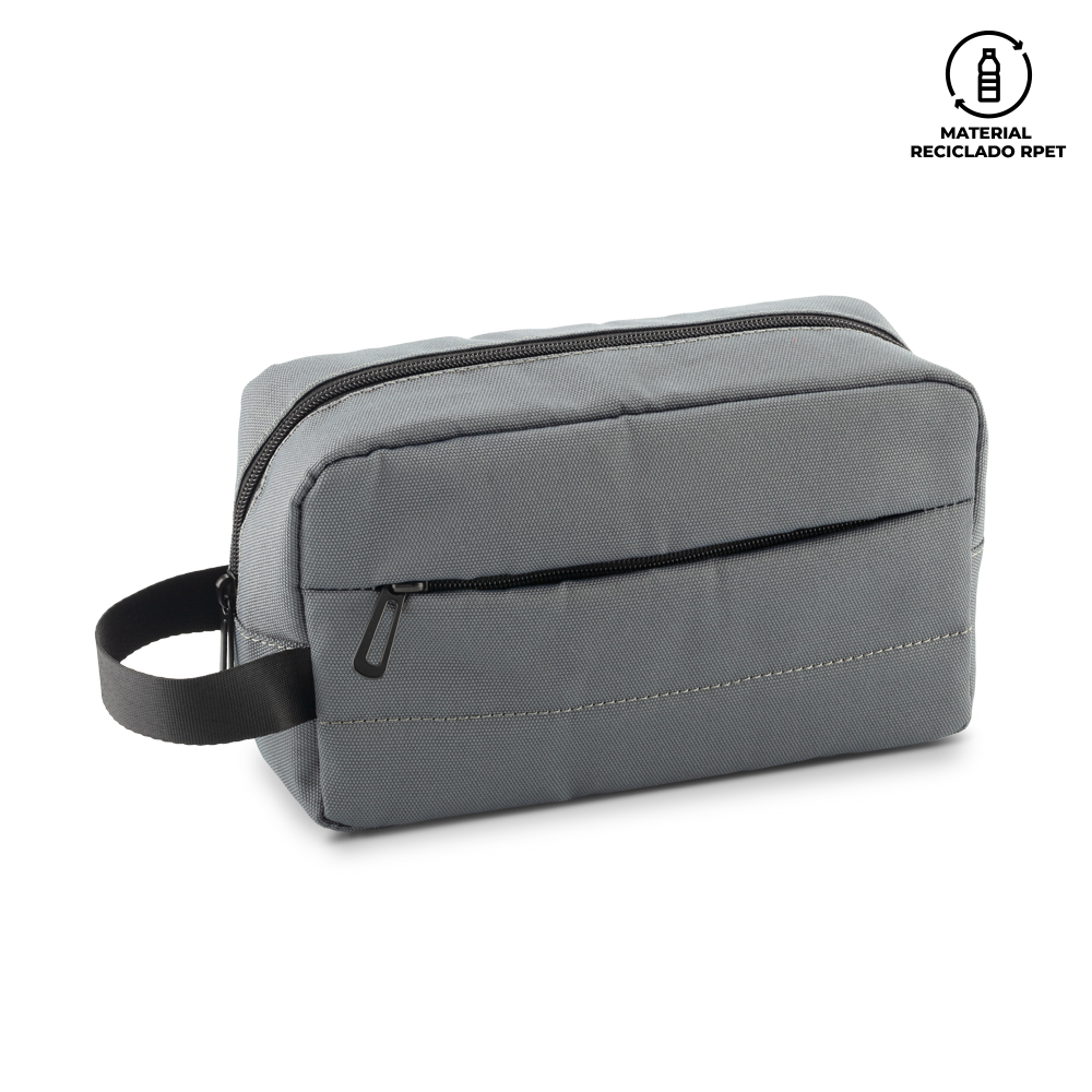 Organizador en poliéster reciclado RPET. Cuenta con un espacioso compartimiento principal, dos bolsillos adicionales (uno con cremallera). Interior y exterior 100% poliéster.