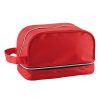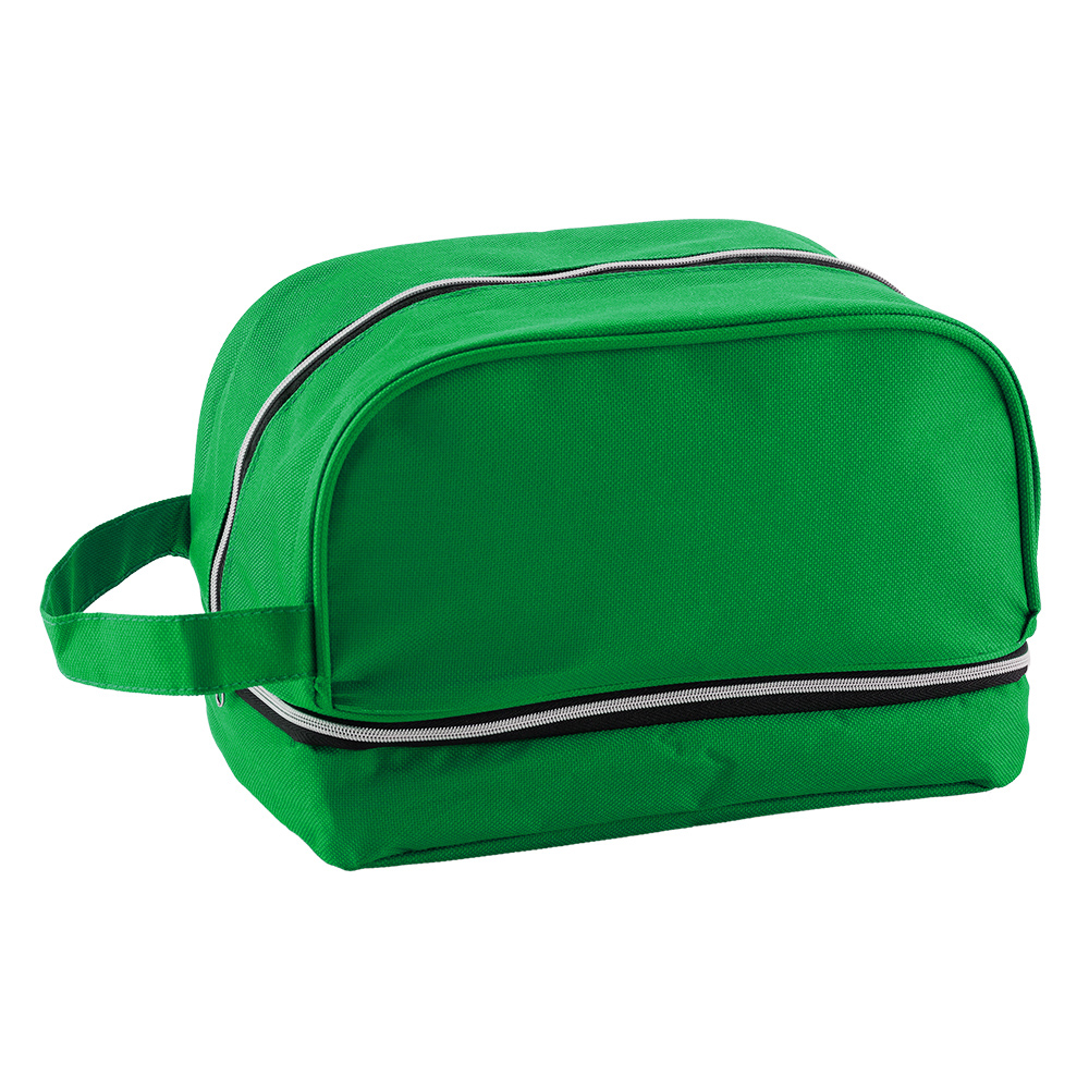 En poliéster, agarradera lateral y dos compartimentos con cierre.