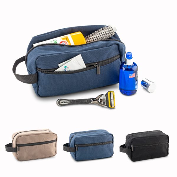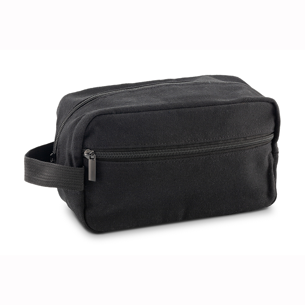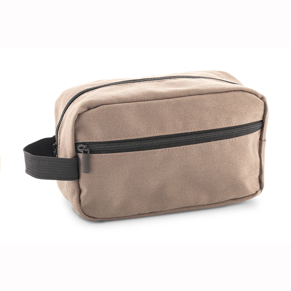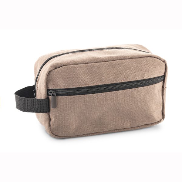 En poliéster y algodón con dos bolsillos externos con cremallera y agarradera lateral.