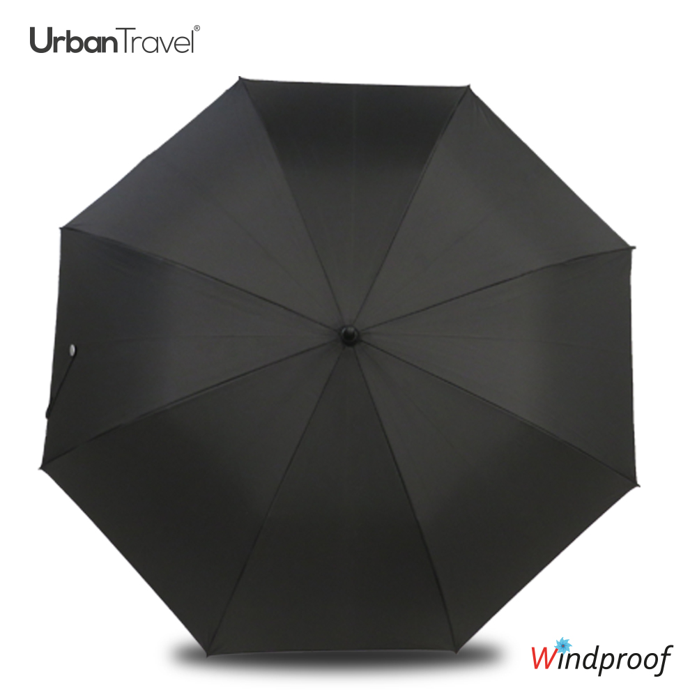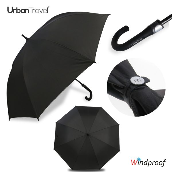 Poliéster pongee Rpet. Apertura automática y cierre manual. Marco en herraje de fibra de vidrio. Mango curvo plástico. Sistema antibrisa. 8 cascos.