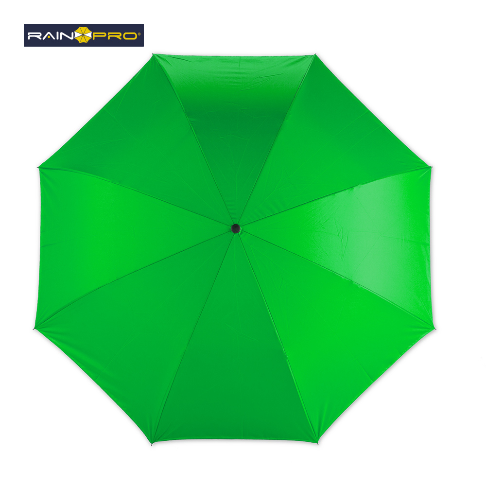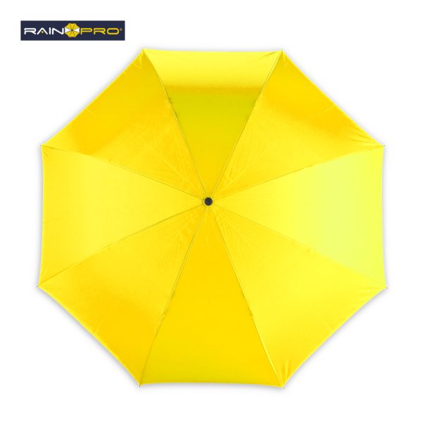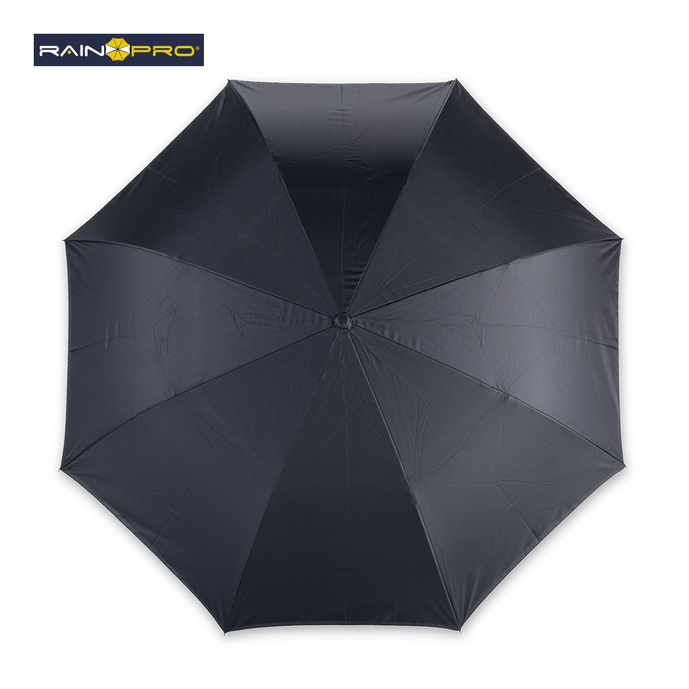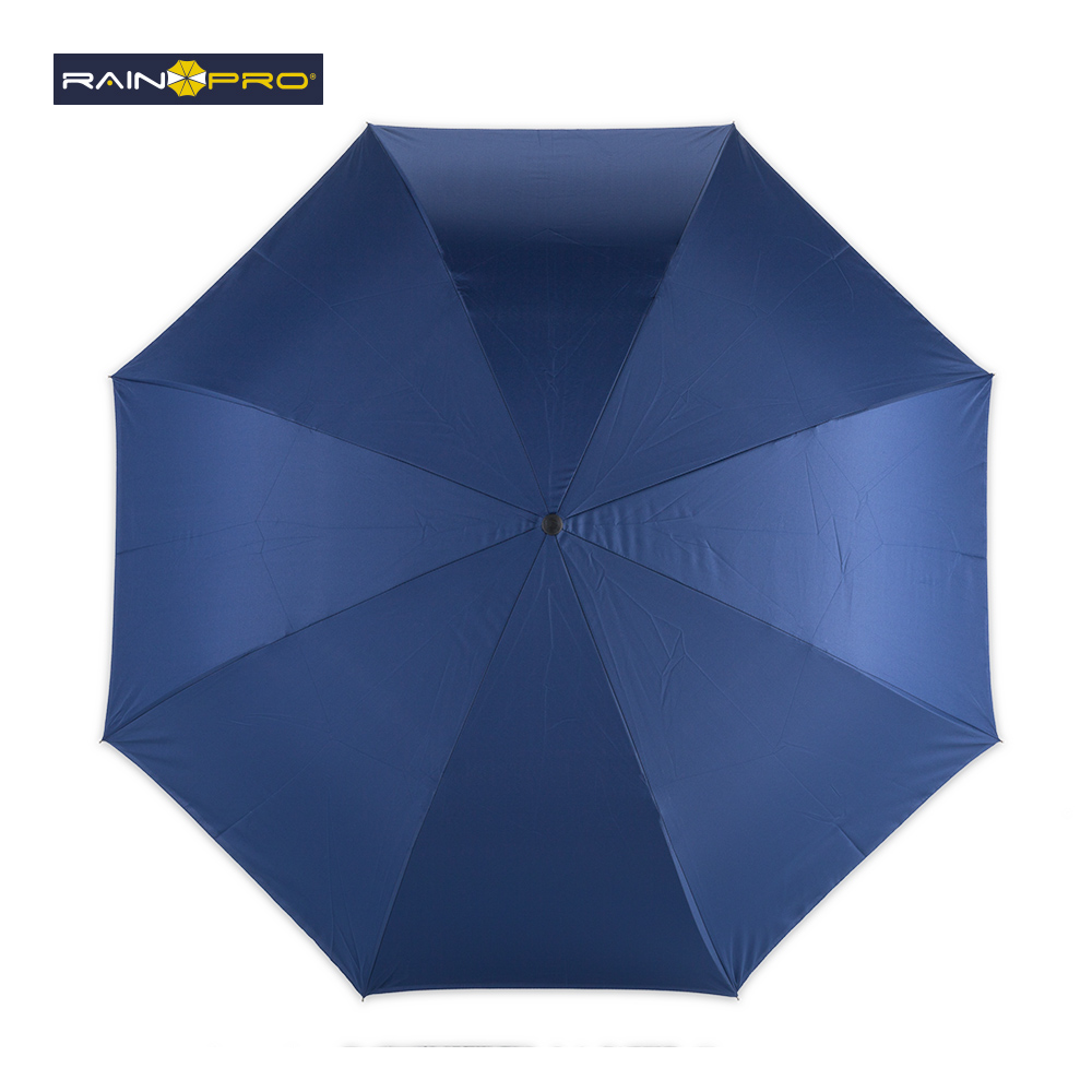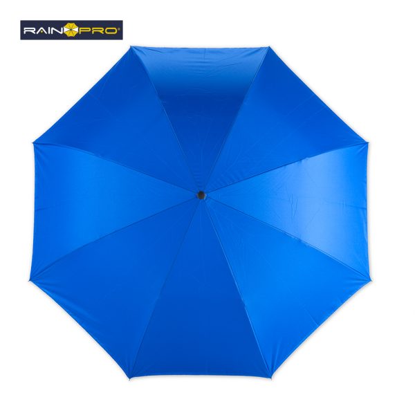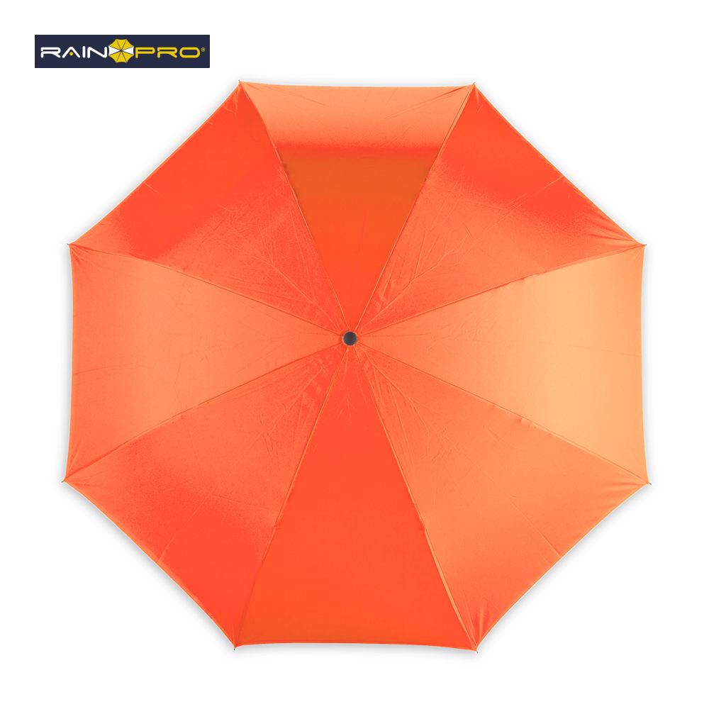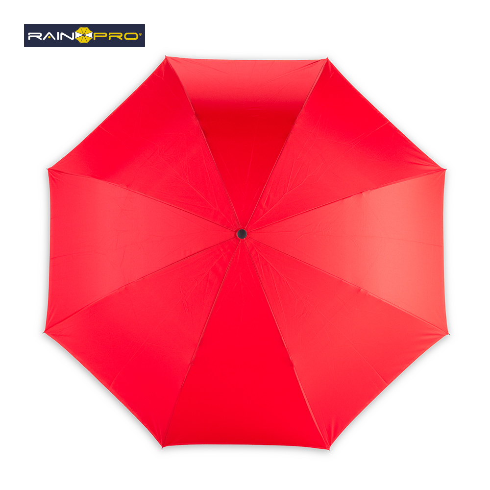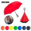 Paraguas invertido (abre al revés) de 23”. Poliéster pongee 190T doble tela. Manual, con estructura metálica y mango en caucho manos libres.