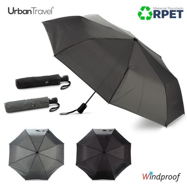 Paraguas plegable en poliéster reciclado RPET y borde reflectivo. Apertura automática. Herraje en fibra de vidrio y acero. Sistema antibrisa, mango en caucho. Con forro para cargar. 8 cascos.