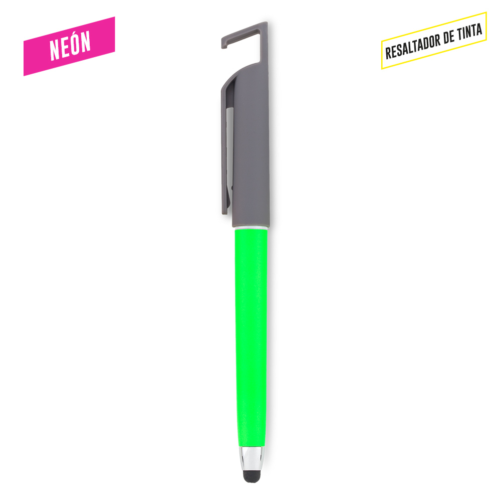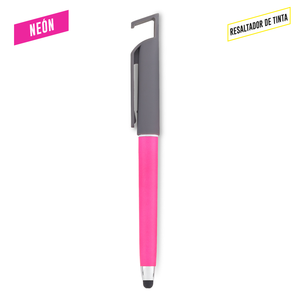Bolígrafo plástico con stylus, resaltador de tinta y portacelular.