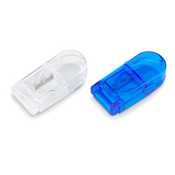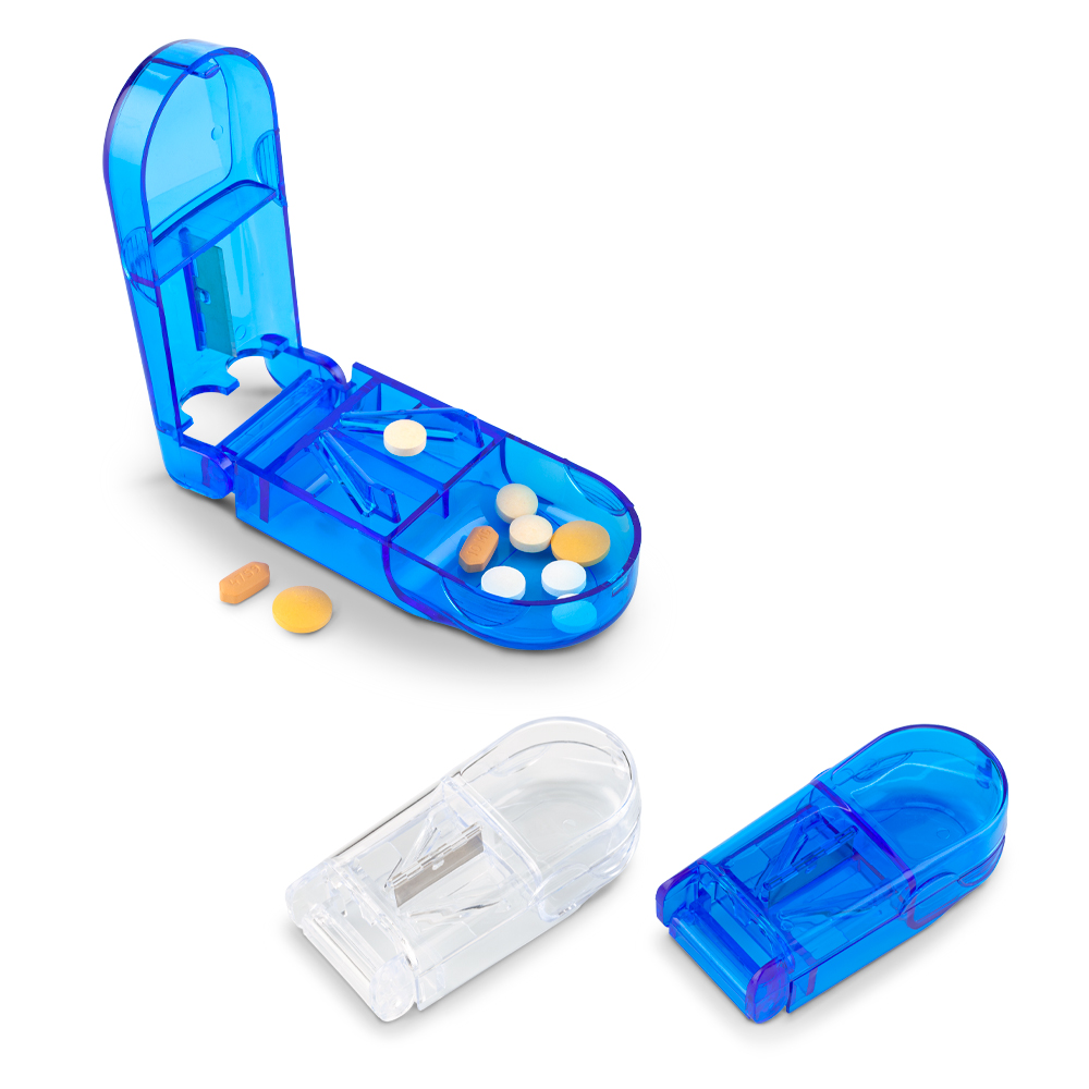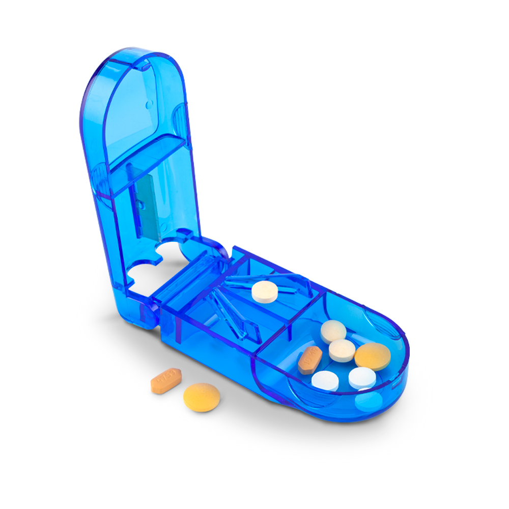 Pastillero plástico con cortador y un compartimiento.