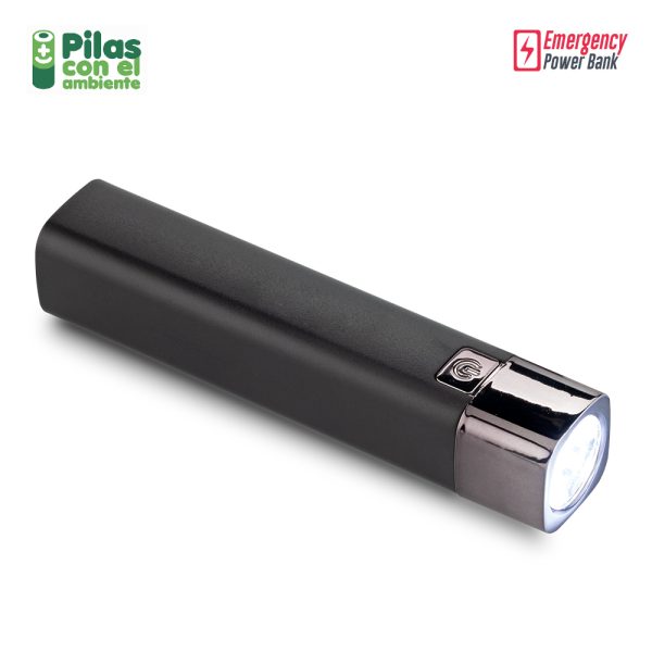 Pila recargable en plástico de 1.200mAh con linterna LED, con salida USB y micro USB. 3 tipos de iluminación. Empaque caja individual.