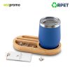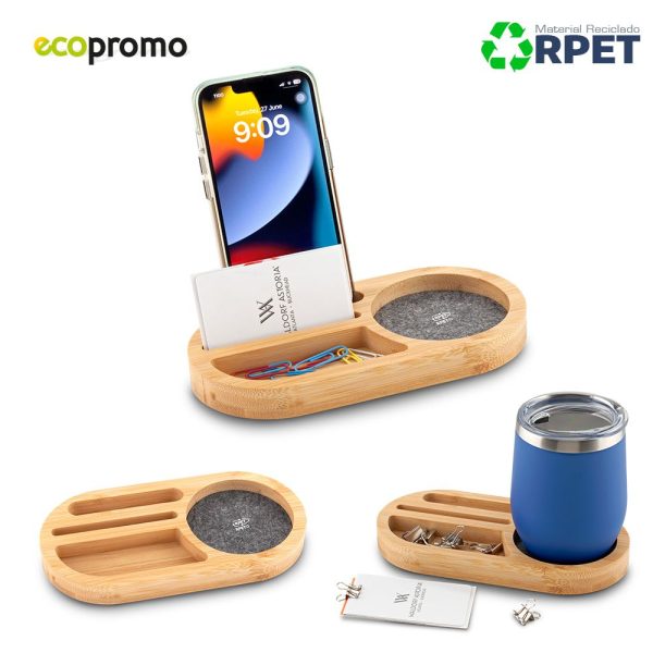 Soporte para móviles con portavasos y organizador. En bambú y poliéster reciclado RPET.