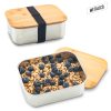 Portacomidas en acero inoxidable con tapa en bambú natural. Capacidad 1000ml. Elástico de cierre. No apto para microondas ni lava vajillas.