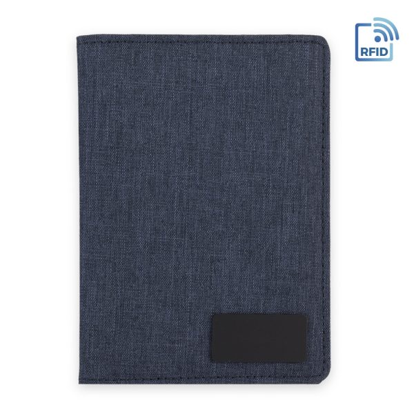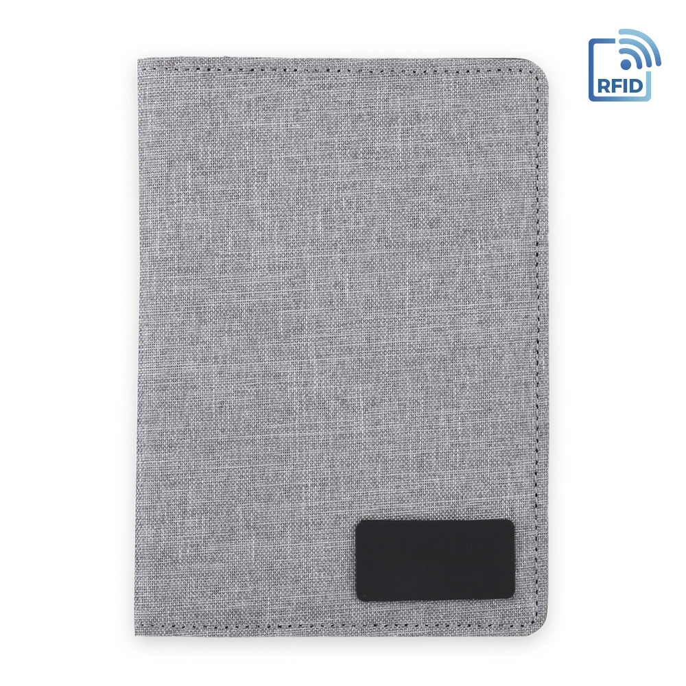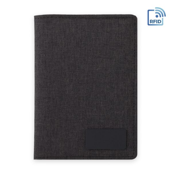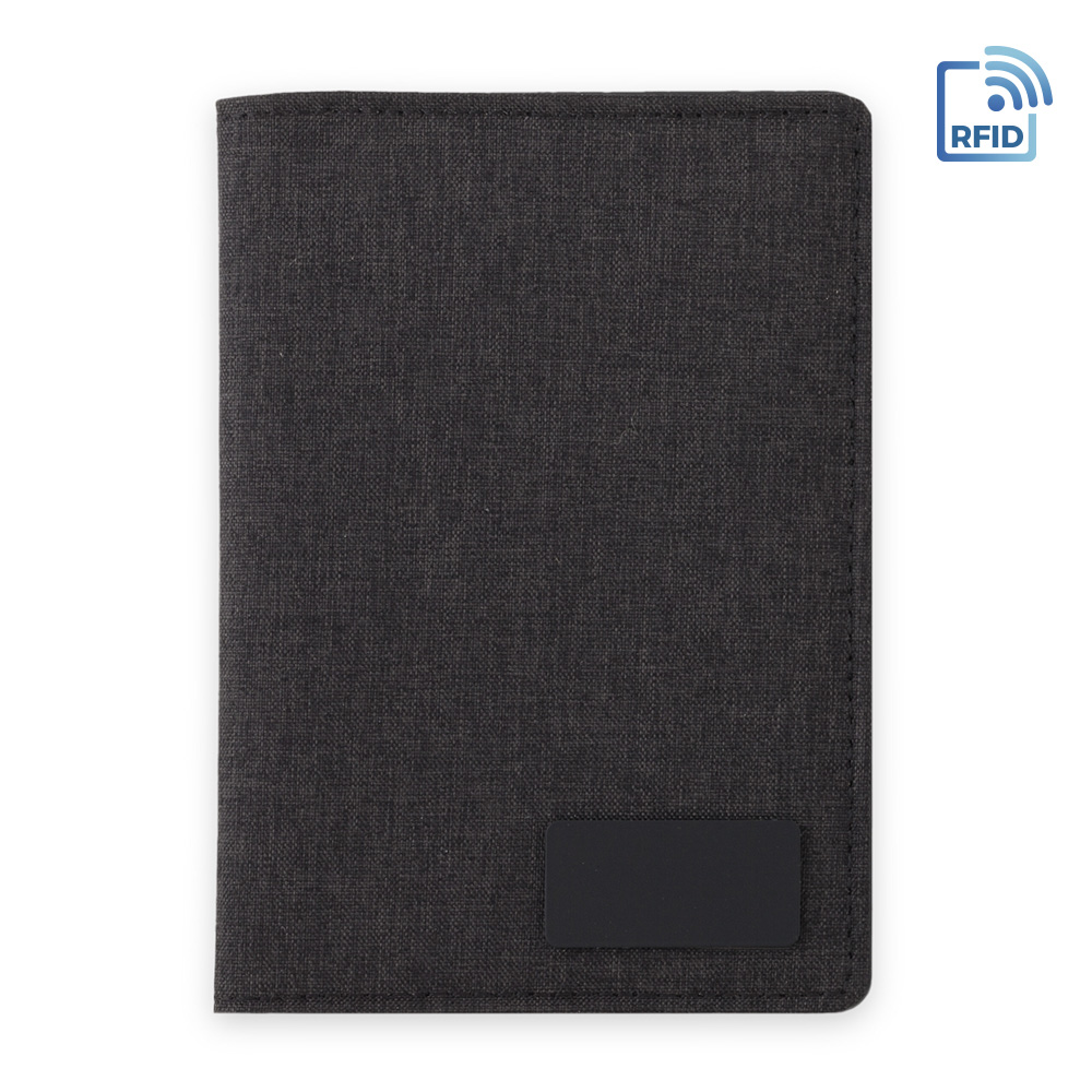 Portapasaporte en lona poliéster. Su material interno permite bloquear las señales electromagnéticas RFID (Radio Frequency Identification) que se usan en
