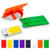 Portatarjetas adhesivo para móviles, parte posterior con tira rígida plegable que sirve como soporte.