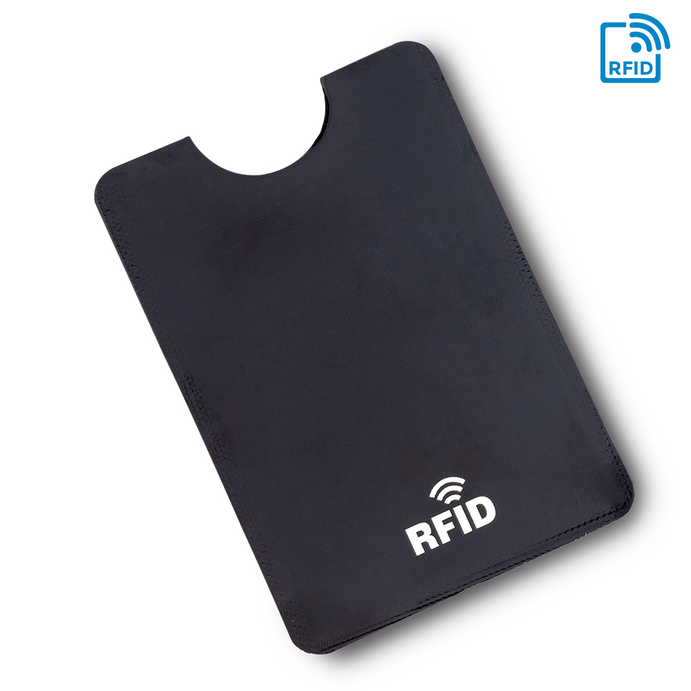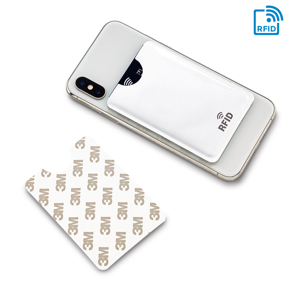 Portatarjetas de un compartimento, elaborado en material laminado y aluminio en el interior. Su material interno permite bloquear las señales electromagnéticas RFID (Radio Frequency Identification) que se usan en tarjetas de chip, tarjetas electrónicas de transporte, etc. Con adhesivo 3M para pegar en la parte posterior del dispositivo móvil.