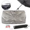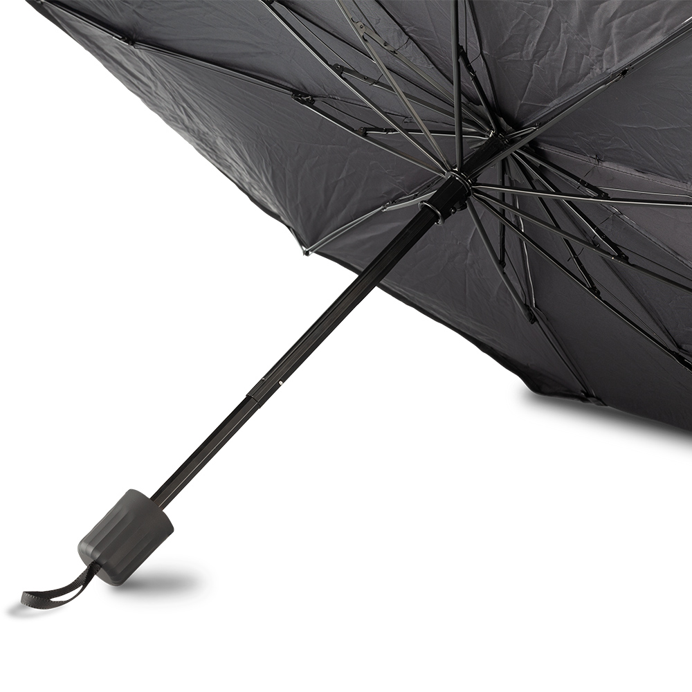 Protector solar para carro en pongee, en forma de sombrilla con recubrimiento en plata, herraje metálico, mango plástico y estuche en PU. Apertura y cierre manual.